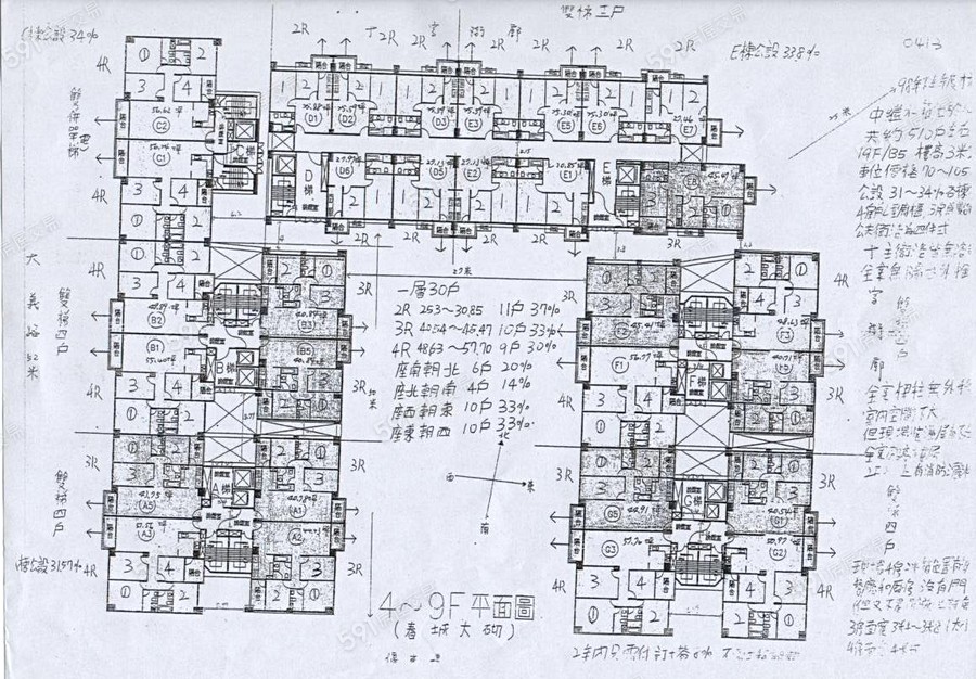 A~G 共七棟A、B、F、G 一層四戶,兩部電梯C一層兩戶,一部電梯DE共為一棟,一層12戶,兩部電梯