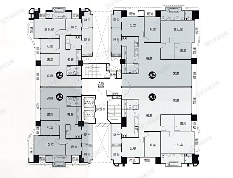 共有四棟,均為每層四戶,每棟共同使用2部電梯