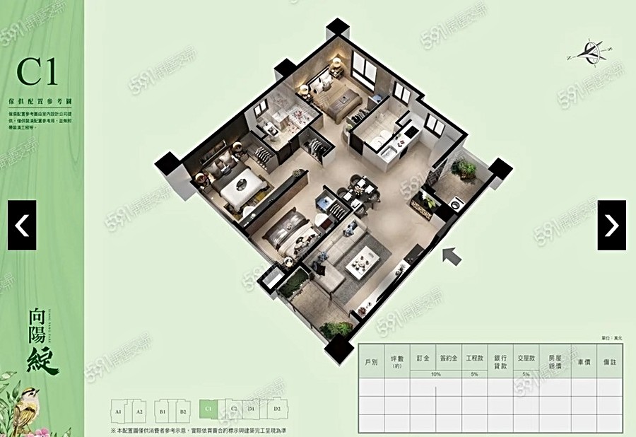 1. 社區規劃:「向陽綻」共3棟建築分成4區,每區皆為2戶1梯配置,梯戶比1:2,電梯配比充足、住戶出入亦較單純。