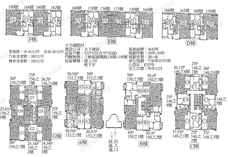 1,一共7棟 A~G棟 2,一層8戶 3,總共2梯