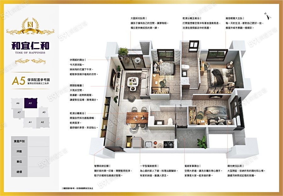 2. 房型規劃:戶戶至少擁雙面採光,室內為明廳、前後陽台設計,臥室與衛浴也都規劃開窗。